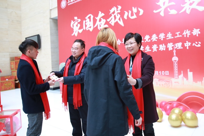 2 月10日是农历年廿九,徐汇校区的图书馆大厅张灯结彩,欢声笑语,在“家国在我心 共襄上应年”的寒假留校学生新春团拜会上,校党委书记郭庆松、校长柯勤飞、党委副书记宋敏娟与留校学子欢聚一堂,为同学们带来了大礼包、“压岁钱”、红围巾及牛年吉祥物等各式新年礼物,满满的仪式感让同学们直呼“超暖心”。