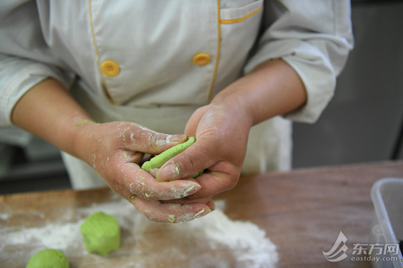 “这种樱花青团是将樱花酱揉在面团里做成的。”食堂的点心师傅介绍,“内馅儿是肉松口味。”据悉,自从青团上市以来,点心师傅每天早上6点就要到岗开始忙碌,而单是中北校区,每天供应的青团总量就在2500个左右,“基本上全部卖完。”